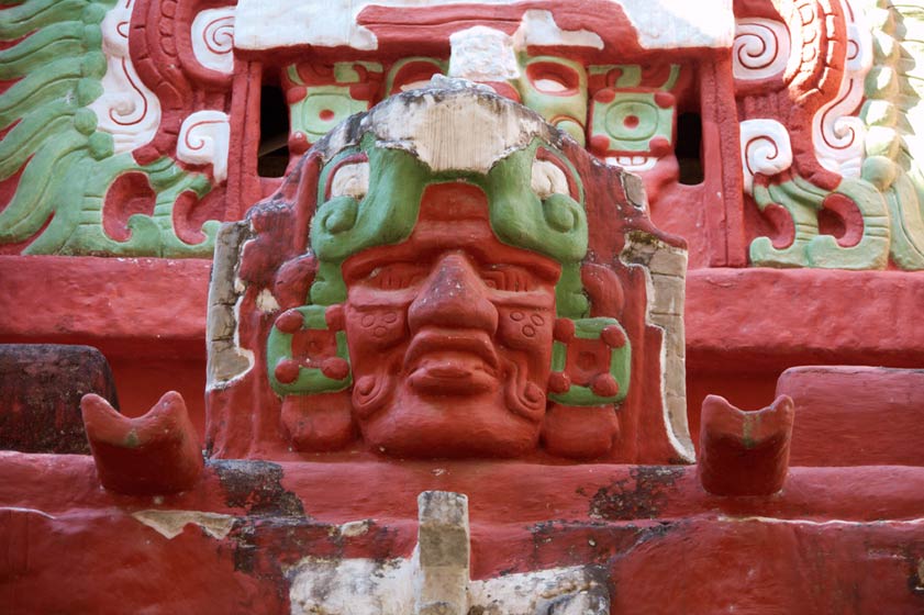 Gezielte Probenentnahmen erlaubten den Archäologen auf den Gesamtbau und besonders das Farbschema zu schließen. Bisher konnte bei keiner anderen Mayastätte die ursprüngliche Farbgebung vollständig nachgewiesen werden! |