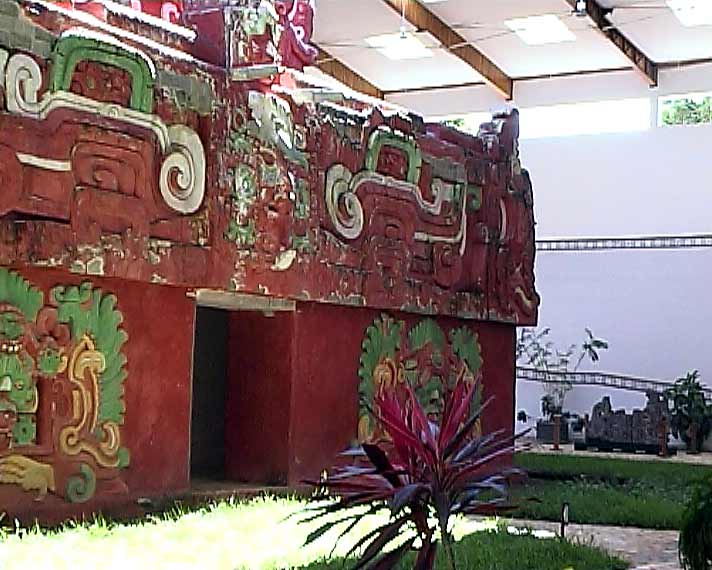 mehr- stöckige Tempel mit einer Basis von 19 x 19 m wurde originalgetreu rekonstriert und ist seit 1996 im Museum in Copan zu besichtigen. |